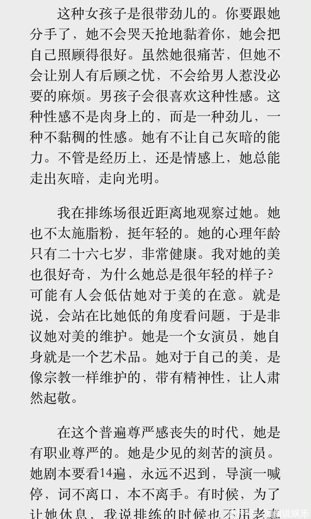 田导以致成心写了一篇著述描画刘晓庆:这种女孩子是很带劲儿的,你跟她分裂了,她不会哭天抢地的粘着你,会把我方护理得很好,诚然很倒霉,但是不会让别东说念主有黄雀伺蝉,不给男东说念主惹贫穷,男孩子会很心爱这种性感,这种性感是一种劲儿,一种不黏稠的性感,她的心理年事唯有26、27岁,相配健康,我对她的好意思很酷好,她自己便是一个艺术品,她的好意思让东说念主骚然起敬,在这个边远庄严感丧失的期间,她是有着职业庄严的,是稀奇的刻苦演员,脚本要看14遍,恒久不迟到,排演的时期真哭,我对她有一种惊怖的赏玩,男东说念主不见得接得住她,也便是送她一程,像刘晓庆这样的演员,应该有东说念主为她量身打造有风范的女性电影,中国电影不够多元,对刘晓庆来说可惜了。